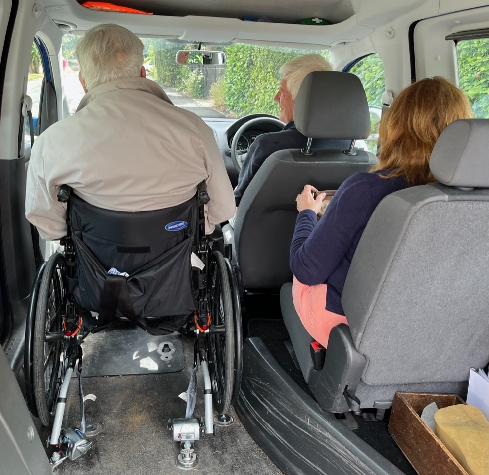 Our vehicle, affectionately known as Carrie, is a specially adapted Volkswagen Caddy. It allows easy assisted access for those in wheelchairs, who sit safely and securely alongside the driver. Not all of our clients use wheelchairs; they are often accompanied by family, a friend or carer.
